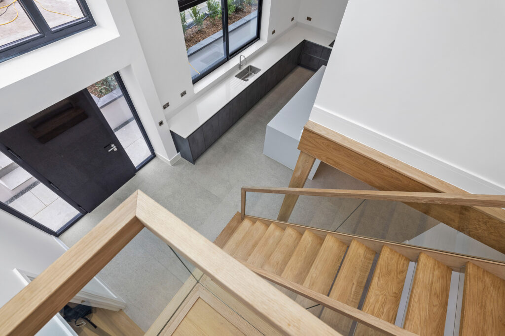 To maximize the usable space, we lowered the ground line by 600mm, a strategic move that enabled the addition of a mezzanine master suite with picturesque views of the garden. Ensuring privacy and tranquility on the mezzanine level, we installed soundproof glass throughout the space.